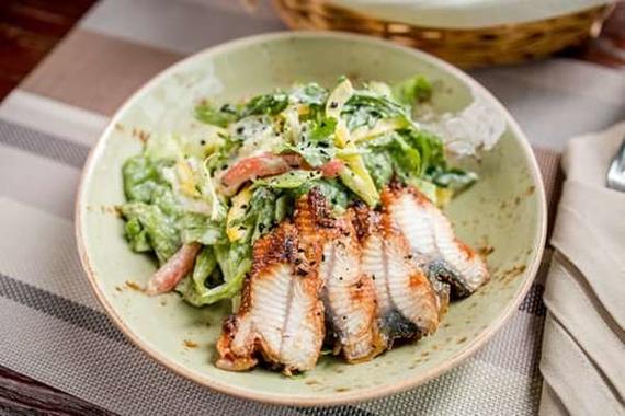 Угорь копченый, микс салата, руккола, помидоры конкасе, шампиньоны, сельдерей, зелень, сыр пармезан, заправляется соусом Конфетюр