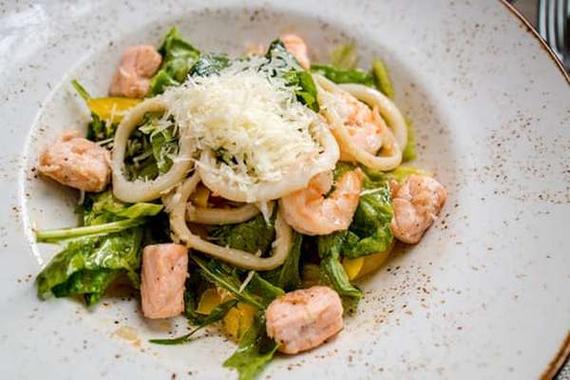 Кольца кальмара, филе лосося, креветки тигровые в сопровождении свежих помидор, огурца, сладкого перца, салатного микса, рукколы и сыра пармезан, заправляется соусом Дрессинг пикадилие