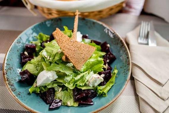 Медовая свекла в сочетании с творожным сыром, миксом зелени и имбирной заправкой, украшается семенами подсолнечника и чипсами из бородинского хлеба