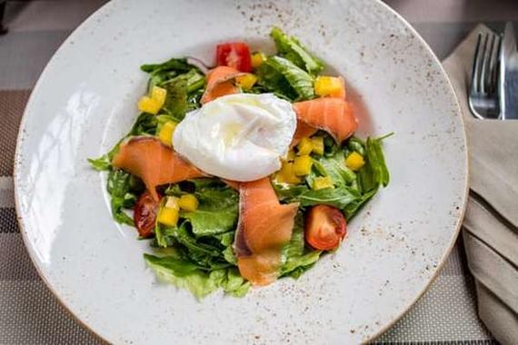 Ломтики слабосоленой семги в сочетании с миксом зелени, рукколы, сельдерея, свежих огурцов, помидоров черри, красного лука и сладкого перца, украшается яйцом пашот и заправляется соусом Лимонный дрессинг