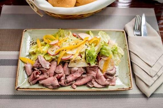 Ростбиф medium в сочетании с помидорами черри, огурцами, редисом и сладким перцем, подается с заправкой из кедрового ореха