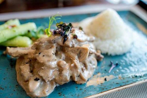 Жареные ломтики филе говядины с шампиньонами и луком в сливочном соусе