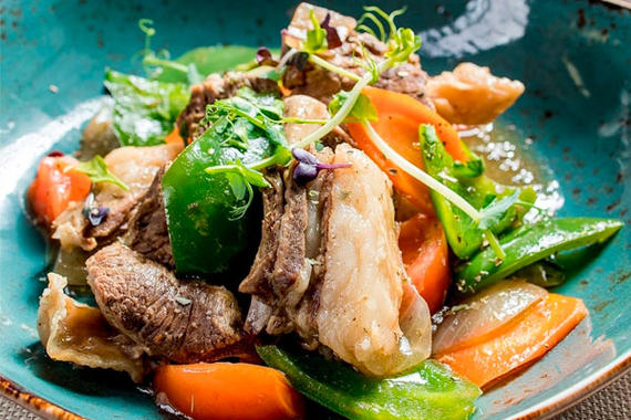 Говяжье ребра тушеные с морковью, луком, сладким перцем и помидорами