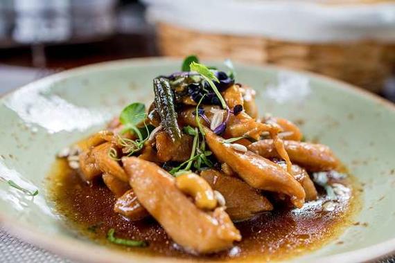 Ломтики курицы, обжаренные с овощами в соусе на восточный мотив