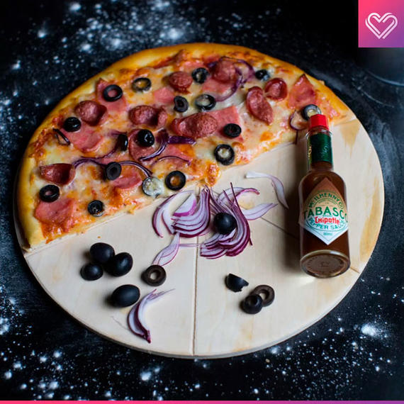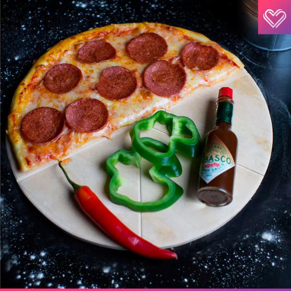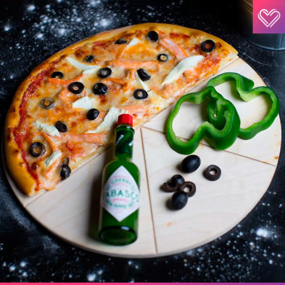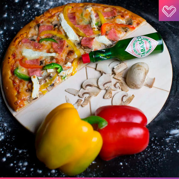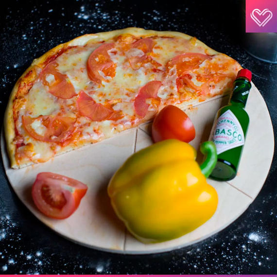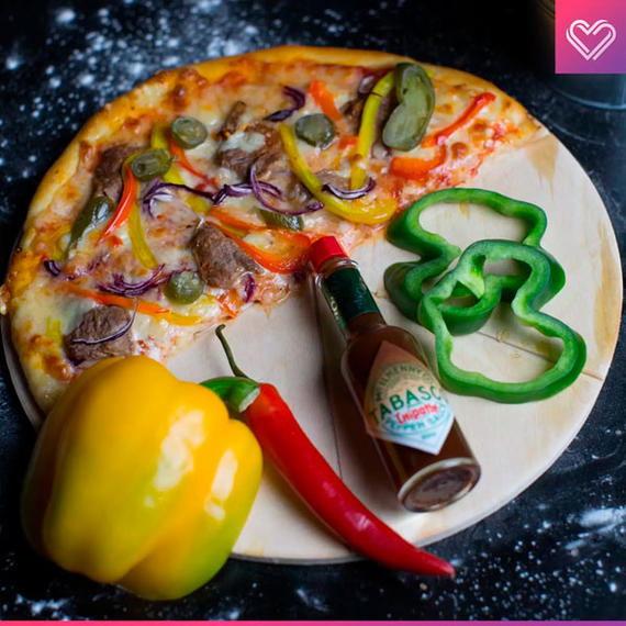 Говядина, лук шалот, болгарский перчик, перчики халапеньо, томатный соус, сыр моцарелла