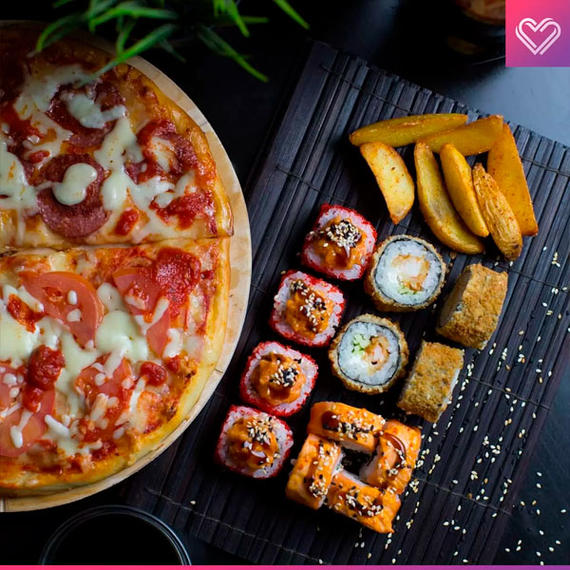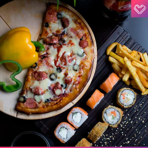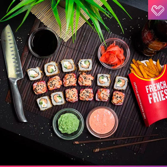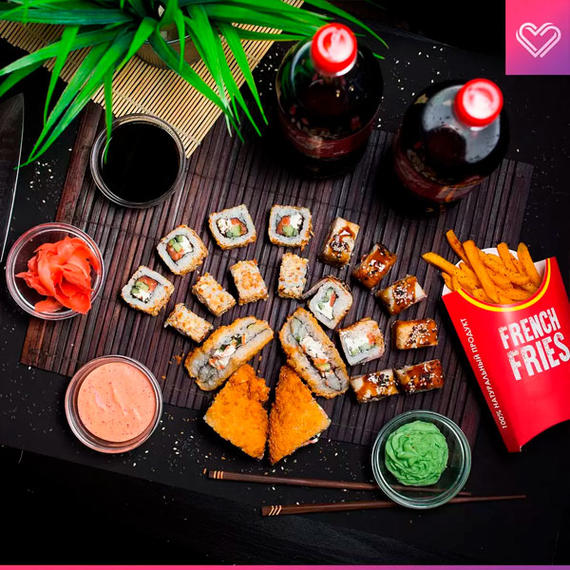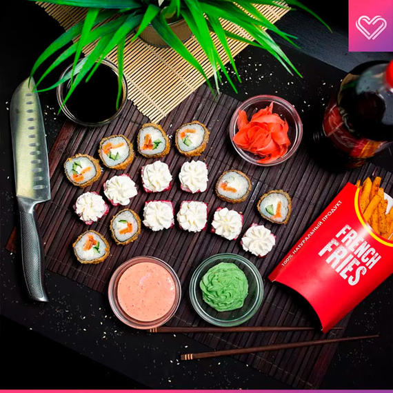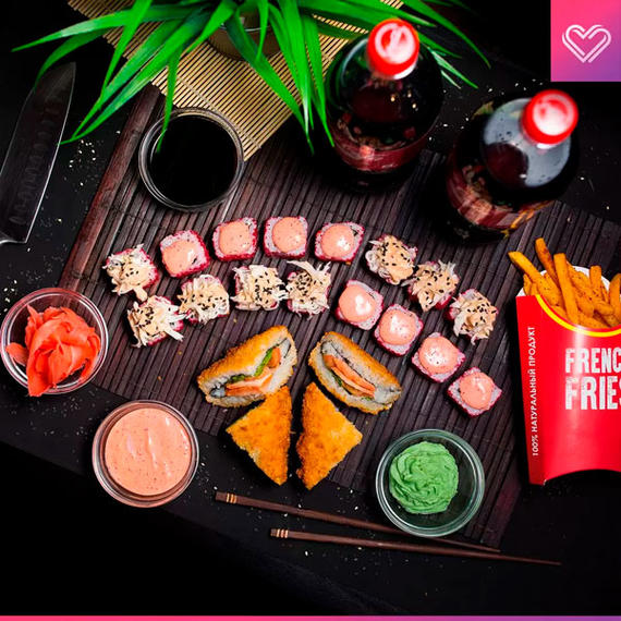 Филадельфия love 8 шт, бешеный лосось 8 шт, эби темпура 8 шт, пицца Маргарита/Салями 50/50, картофельные дольки, Coca-Cola 2 л.