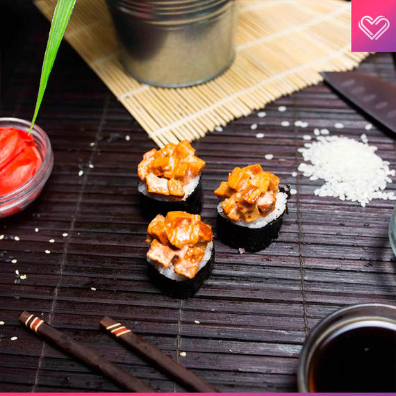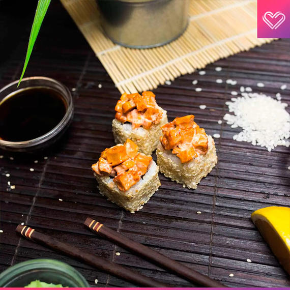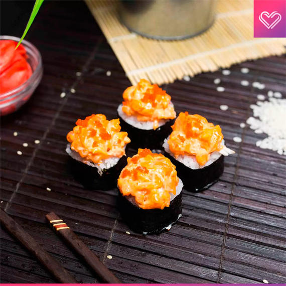 Сыр креметте, томаго, угорь, кунжут, спайси соус