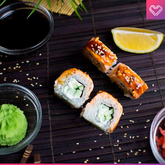 Огурец, угорь, томаго, спайси соус
