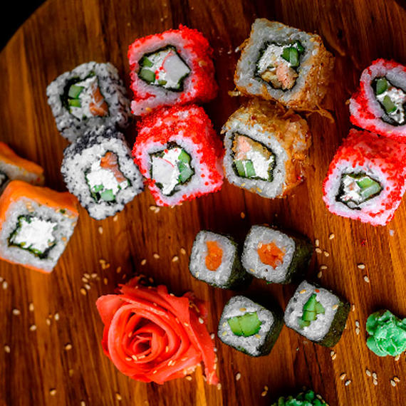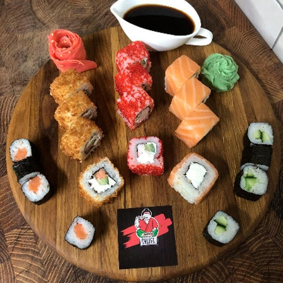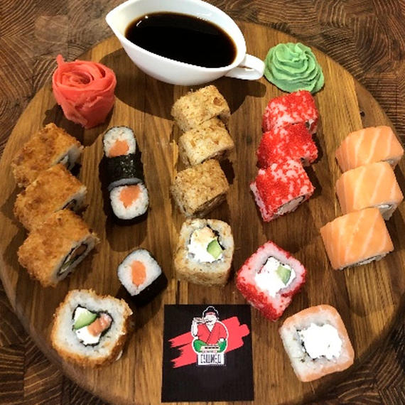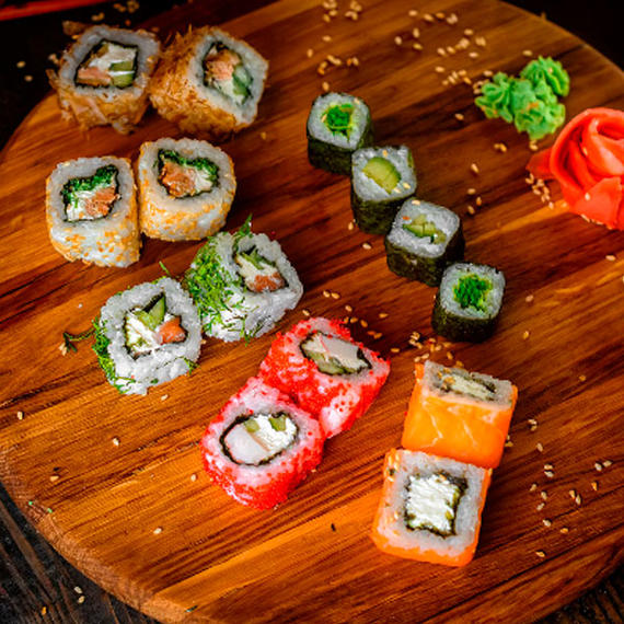 Филадельфия*2 прц, Калифорния с крабом, Калифорния black, Бонито с лососем, Бушидо, Хосомаки с огурцом*2 прц, Хосомаки с лососем * 2 прц