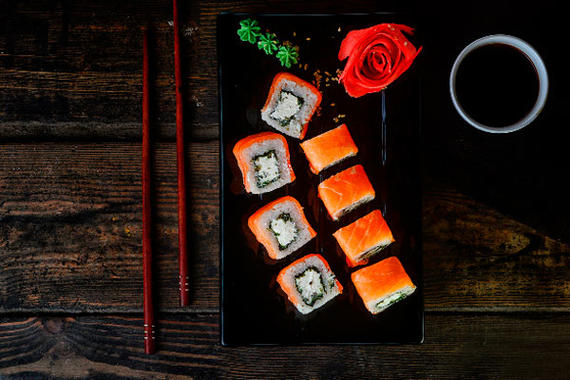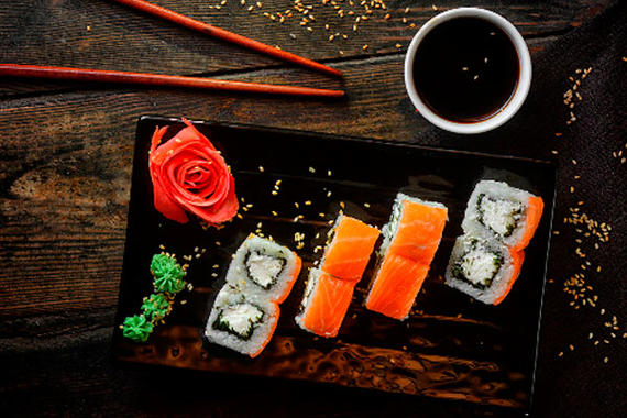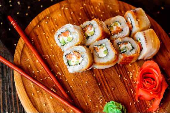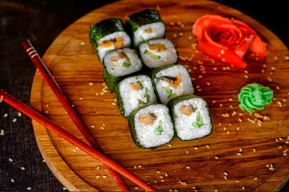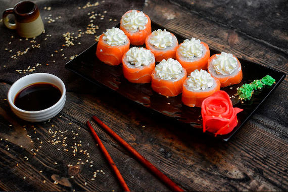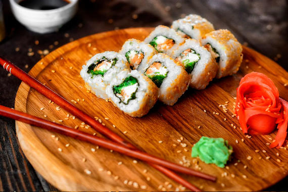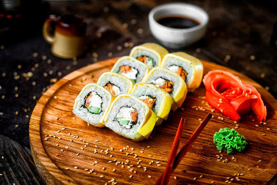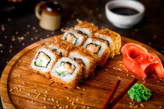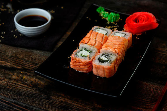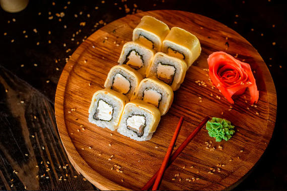 Рис, нори, сыр, лосось, имбирь, огурцы, икра тобико