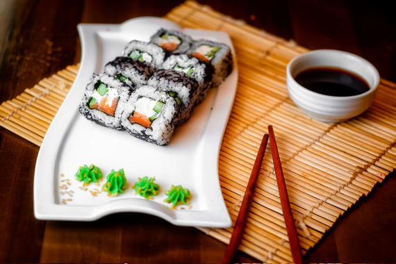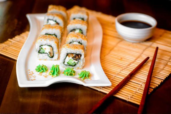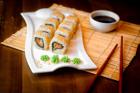 Рис, нори, сыр, огурцы, лосось, угорь, унаги соус, кунжут