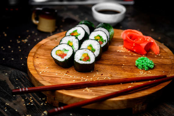 Рис, нори, помидор, огурцы, болгарский перец, лист салата