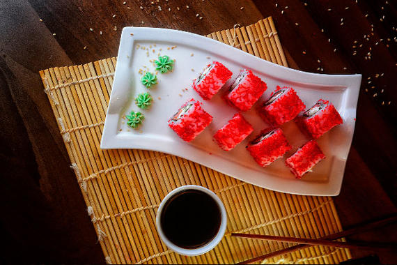 Рис, нори, сыр, лосось, огурцы, икра тобико
