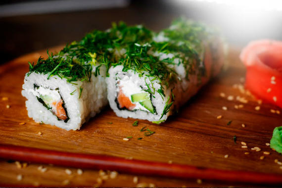 Рис, нори, сыр, лосось, огурцы, зелень укропа