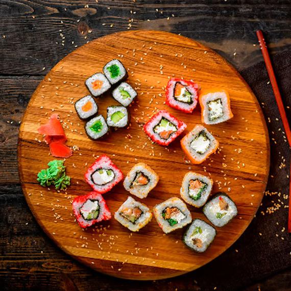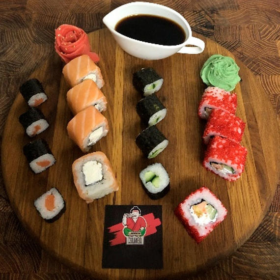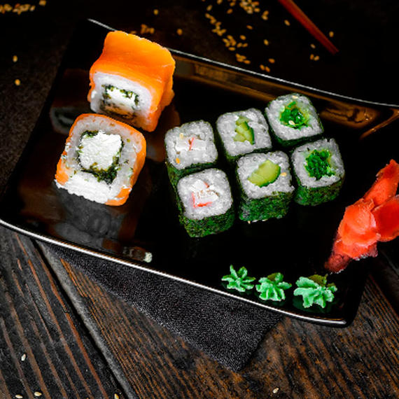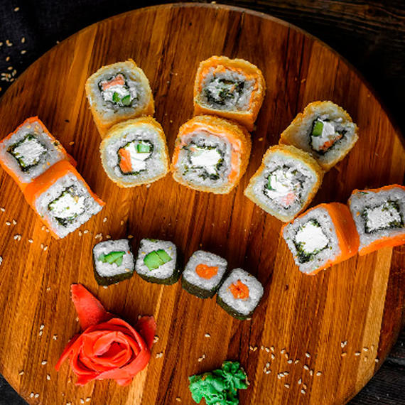 Филадельфия, Бонито с лососем, Хоккайдо, Хосомаки с чуккой, Хосомаки с огурцом (2 прц.)