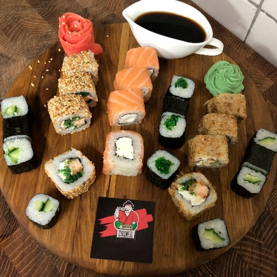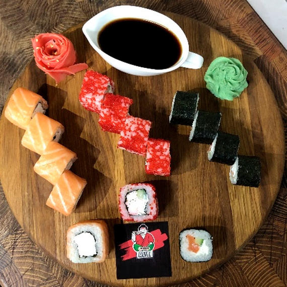 Филадельфия*2 прц, Калифорния с крабом, Калифорния black, Бонито с лососем, Бушидо, Хосомаки с огурцом*2 прц, Хосомаки с лососем * 2 прц