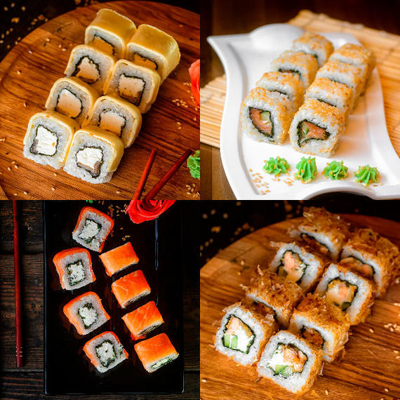 Филадельфия, Киото ролл, Хосомаки с лососем, Хосомаки с огурцом