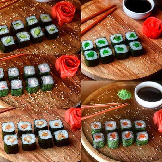 Хосомаки с огурцом, Хосомаки с лососем, Хосомаки с чуккой, Филадельфия