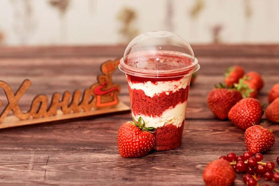 Десерт в стакане Красный бархат. Крошка нежного бисквита насыщенно-красного цвета с нежным сливочно-сырным кремом, дополняет вкус и придаёт изюминку клубнично-вишневый соус.