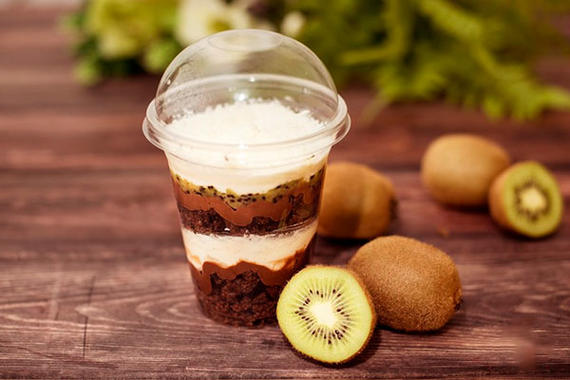 Шоколадный десерт с киви: воздушный шоколадный бисквит, политый шоколадным ганашем, легкий крем, и соус из кусочков киви