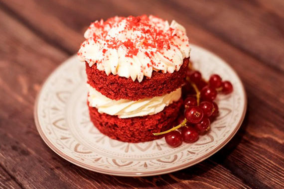 Пирожное Красный бархат. Пористый влажный бисквит, насыщенно-красного цвета с нежным сливочно-сырным кремом.